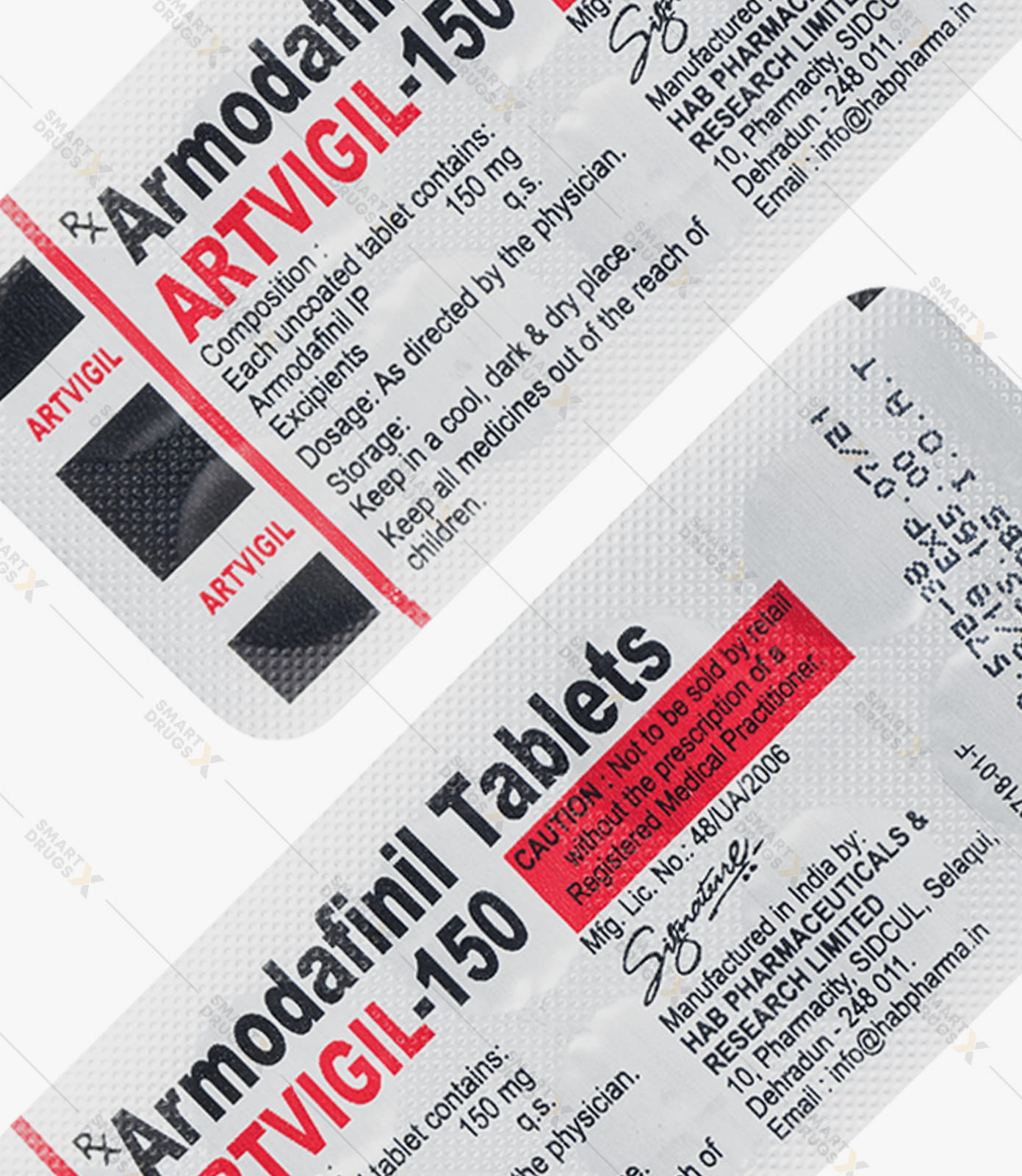 • Artvigil is a generic form of Armodafinil (called Nuvigil – In the USA). Each tablet contains exactly 150 mg of Armodafinil, manufactured by HAB Pharmaceuticals & Research Ltd. Armodafinil is also manufactured by the same company as Modalert (Sun Pharma) and available here as Waklert.